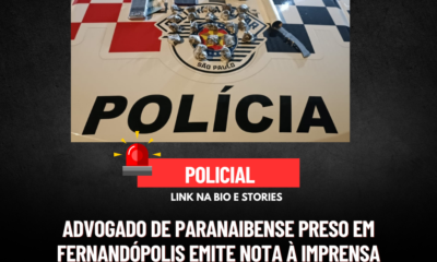 Cidade2 anos atrásAdvogado de paranaibense preso em Fernandópolis (SP) emite nota à imprensa
