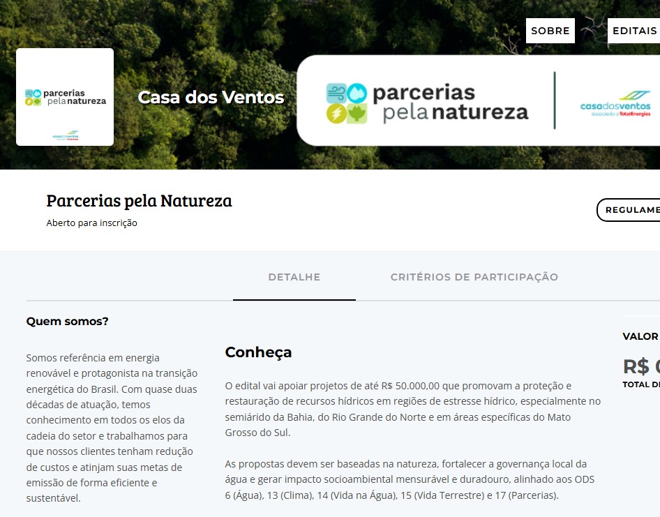 O Edital “Parcerias pela Natureza” da Casa dos Ventos está com inscrições abertas. Em nossa Jornada pela Natureza, essa chamada para ação gera valor e impacto positivo para o Meio Ambiente nos Territórios onde atuamos.