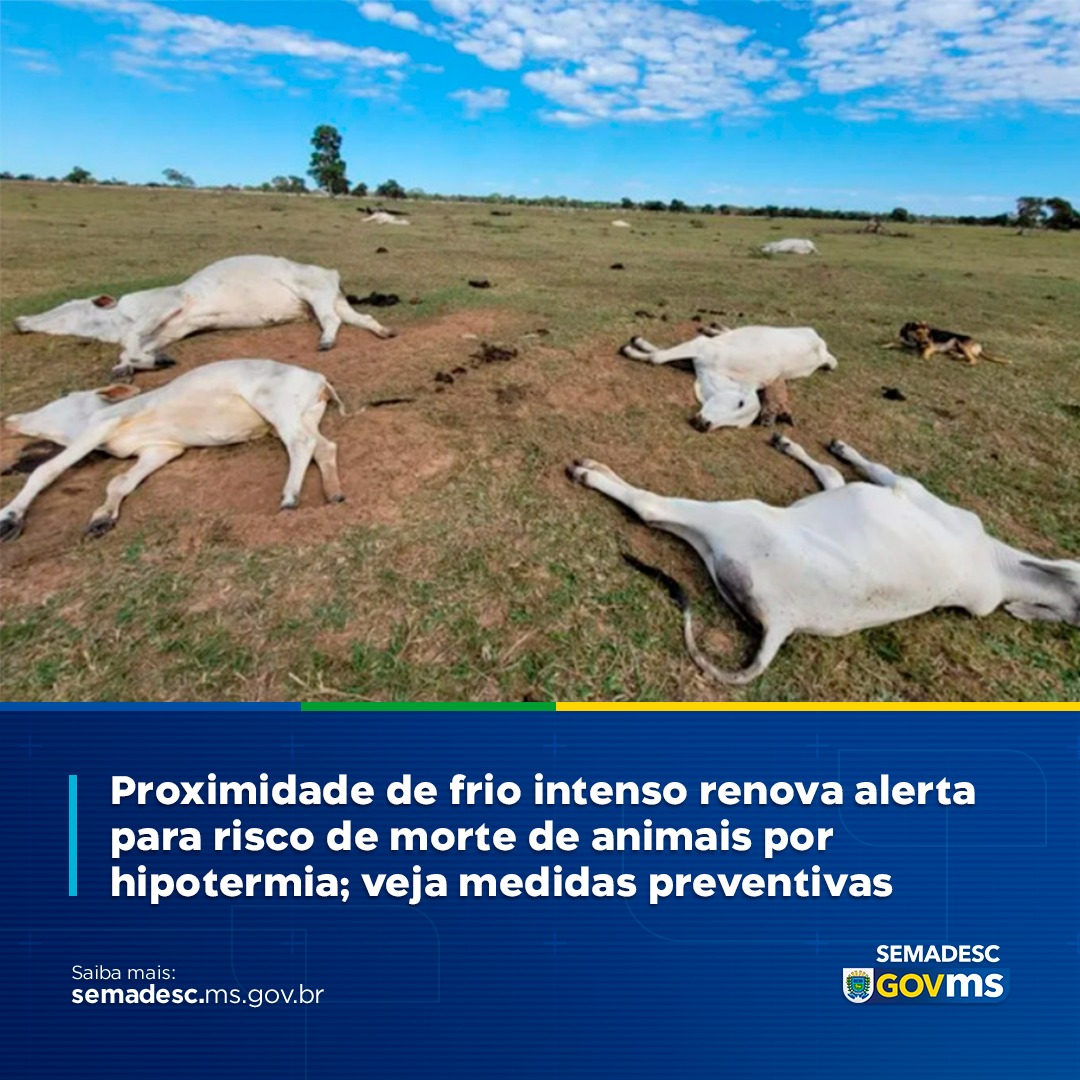 Uma onda de frio intenso atingirá  o Estado durante a semana. Os termômetros podem chegar a próximo de zero grau em algumas localidades, conforme análise dos técnicos do Cemtec/MS (Centro de Monitoramento do Tempo e do Clima), órgão vinculado à Semadesc. Diante disso, a Iagro (Agência Estadual de Vigilância Sanitária Animal e Vegetal), também vinculada à Semadesc, alerta para os riscos da hipotermia que tem matado milhares de cabeças de gado nos anos anteriores.
