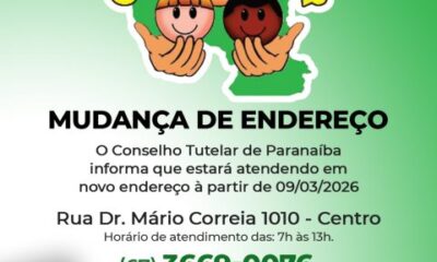 Atenção, comunidade de Paranaíba! O Conselho Tutelar está em novo endereço a partir do dia 09 de março de 2026: 📍 Rua Dr. Mário Correia, 1010...